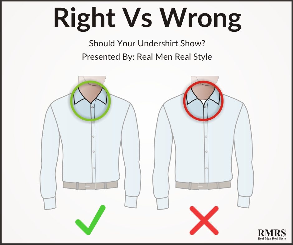 If you happen to go away your collar unbuttoned, go for a deep v-neck undershirt. A well-cut undershirt will not be seen within the collar space even when the highest two shirt buttons are unbuttoned.